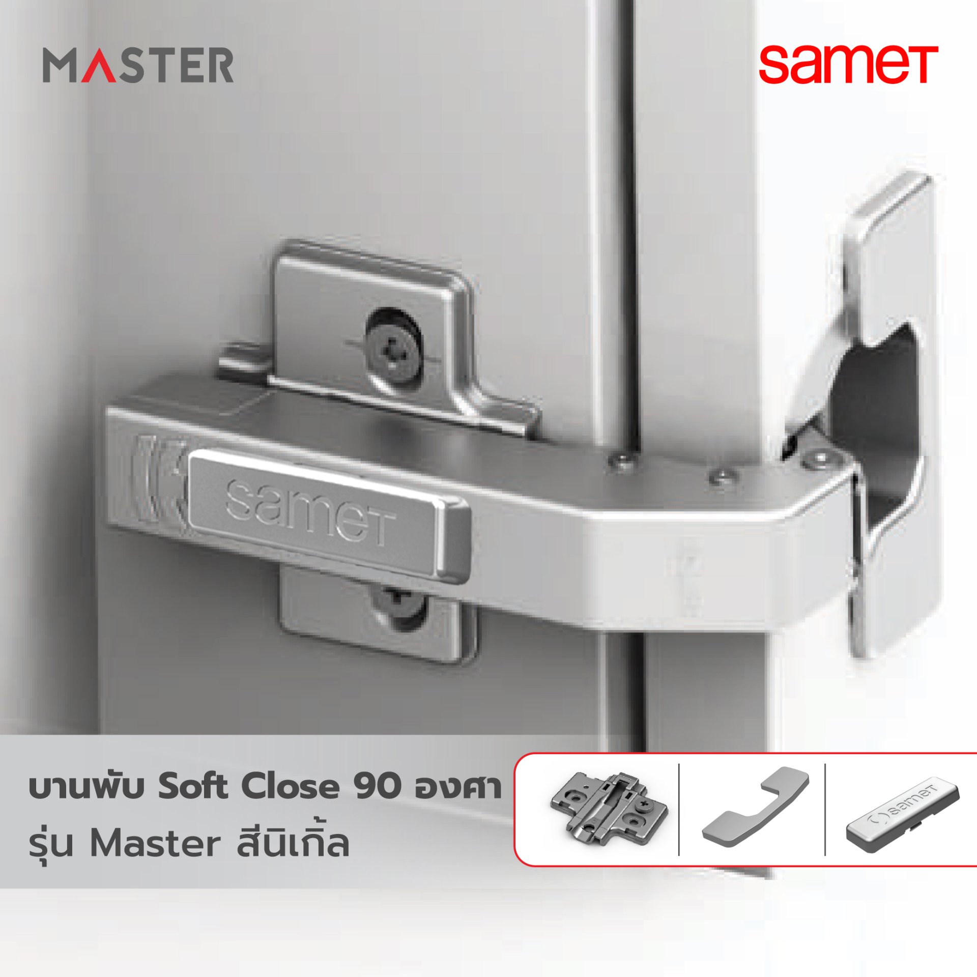 บานพับถ้วย Soft Close 90 องศา รุ่น Master สีนิเกิ้ล พร้อมขารองหนุนและฝาปิดครบชุด (แบบริมขอบ)