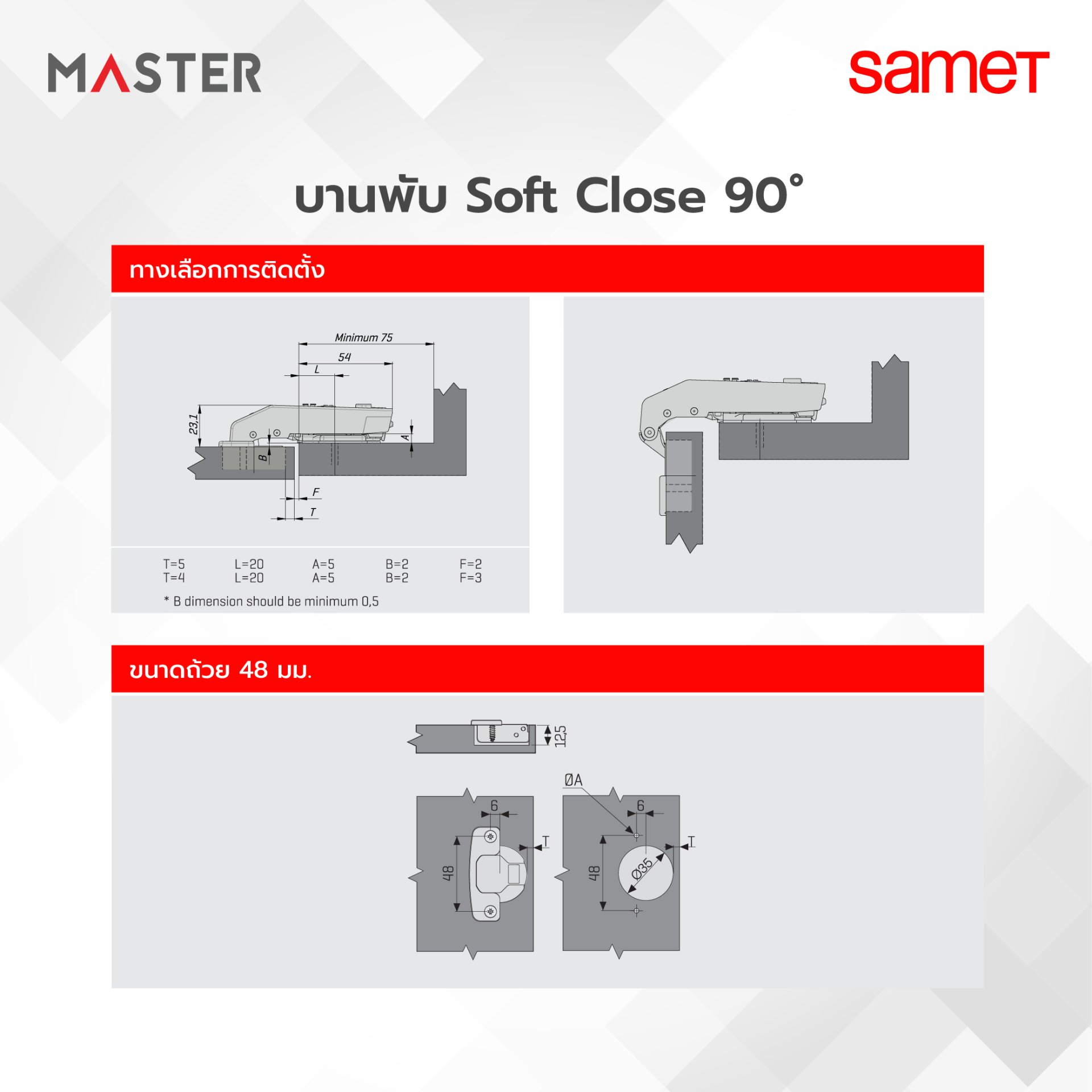 บานพับถ้วย Soft Close 90 องศา รุ่น Master สีนิเกิ้ล พร้อมขารองหนุน (แบบริมขอบ)